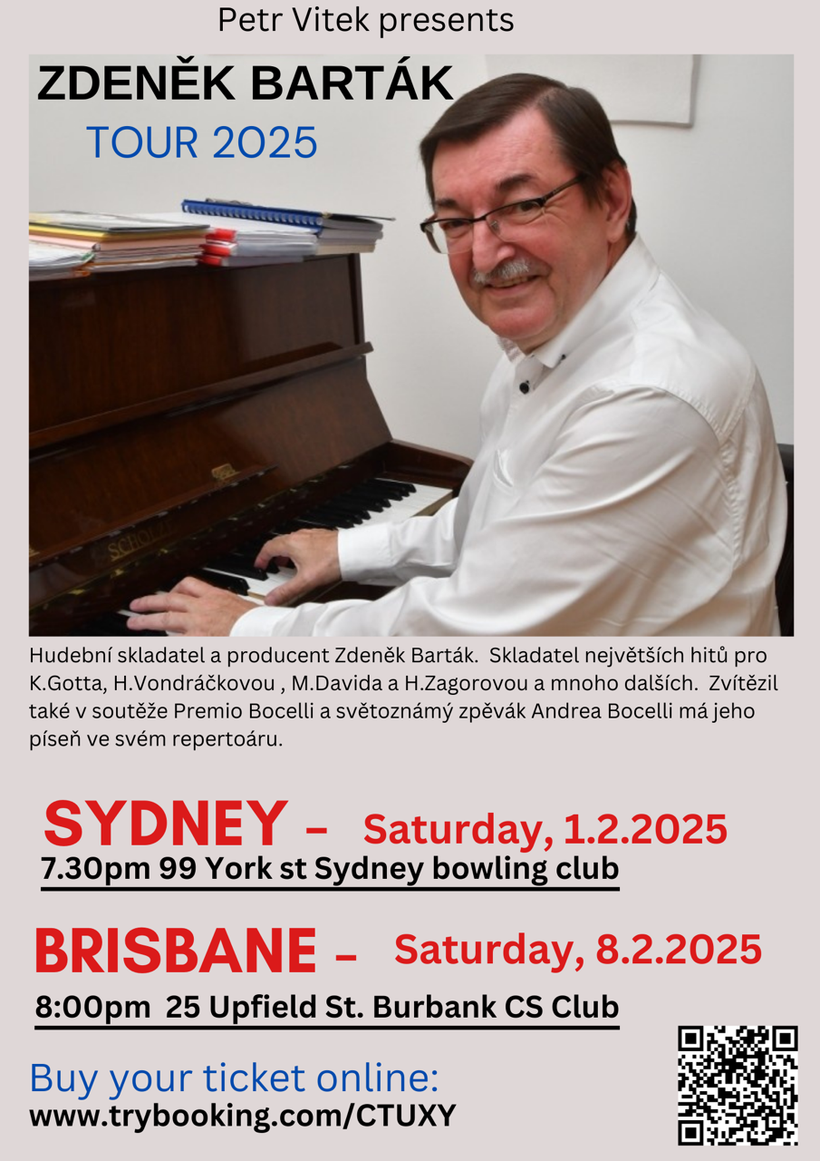 🎹 Hudební skladatel a producent Zdeněk Barták přichází se svou australskou tour! Autor největších hitů pro Karla Gotta, Helenu Vondráčkovou, Michala Davida a Hanu Zagorovou, s vítěznými skladbami prestižní soutěže Premio Bocelli, zavítá také do našeho klubu v Brisbane.